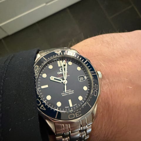 Ved raskt og smidig salg kan jeg også legge ved en original Omega nylonrem i «summer blue» og en cordovan-skinnrem fra Molequin med original Omega-spenne. Begge passer klokken ypperlig.