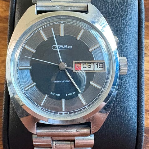 Vintage Slava automatisk klokke selges Ganske god stand. Klokken tikker og går og holder tiden godt.