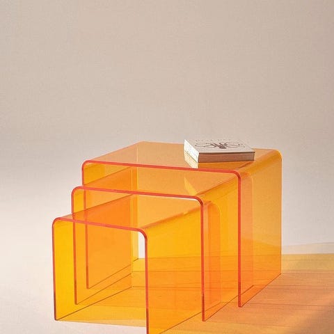 Rundt sofabord med stamme i forkrommet metall. Fire plater i herdet klart glass. De to midterste platene kan svinge fritt slik at du kan gi bordet den fasongen du ønsker. Glassplatene er avtagbare. Diameter på topplaten og bunnplaten 45 cm. Diameter på midtplatene 40 cm. Avstand mellom platene 11,5/9/11,5 cm.