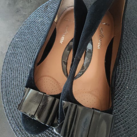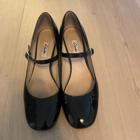 Superlekre svarte lakk Clarks ballerina med hæl i størrelse 39,5. hælhøyde 5 cm-4,5. Skoene er laget i svart lakkskinn og har en lukket tå med stropp over vristen. Hælhøyden er moderat, og skoene har en glatt såle. Passer til formelle anledninger eller bruk som pent fottøy. Brukt 2-3 ganger. Et bittelite «sår» i tuppen av venstre sko, lite synlig. Veldig fine!