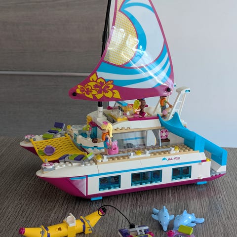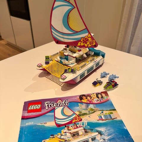 LEGO Friends 41317 Sunshine Catamaran og tilhørende minifigurer. Inkluderer flere detaljer som cockpit, dekk og ulike tilbehør for lek og bygging. Komplett.