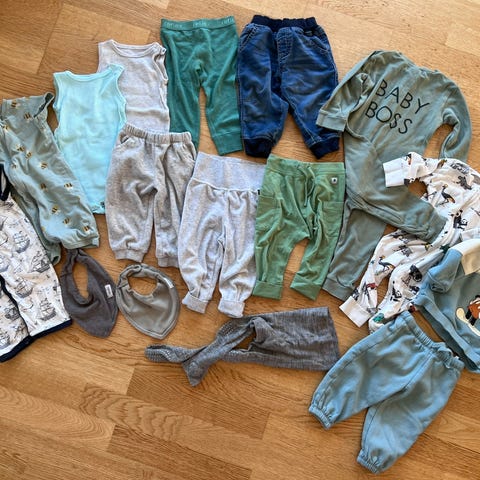 Litt slitasje på ene snora til buksa, som vist på bilde nr 2. Ellers er klærne hele, ingen flekker.
