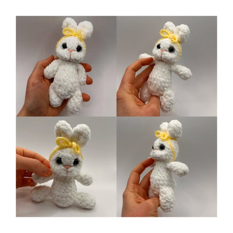 Nydelig håndlaget sett bestående av en heklet kaninbamse og en matchende biteleke.