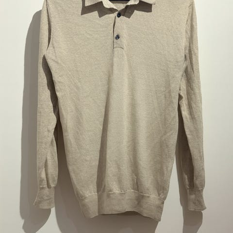 Genseren har rund hals, ribbestrikkede avslutninger og en dyp marineblå farge som passer til det meste. Perfekt både over skjorte eller brukt alene til jeans eller chinos. Pent brukt og godt ivaretatt.