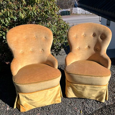 Vi selger to nydelige stoler i grønt trekk og med trebein. De er nette i størrelse.