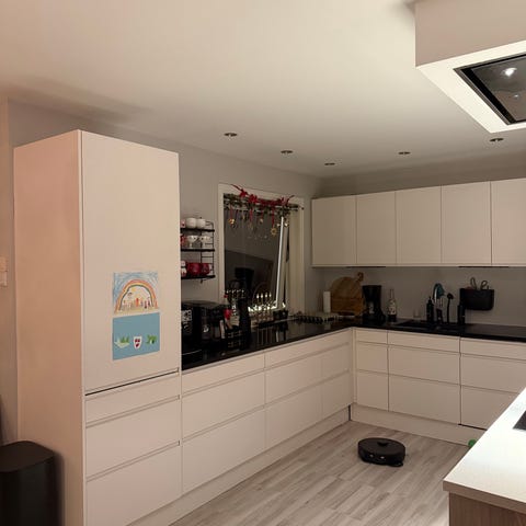 Kjøkkeninnredning fra Lignum. Skrog i finert eik, med slette hvite fronter. Kompositt benkeplate (hvit med lys marmoreing). Platetopp fra AEG med kullfilter, og komfyr fra Blomberg følger med, mens den integrert oppvaskmaskinen medfølger ikke. Overskapene er demontert, mens benkeskapene må demonteres av kjøper.