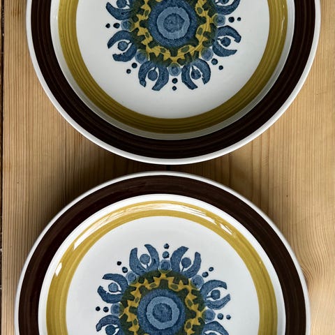8 stk romslige krus med god hank å holde i, i brunt. 12 cm høye.