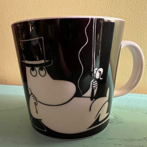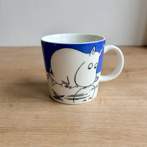 Arabia Mummitrollet kopp i lilla farge med Mummitrollet-motiv. Laget av keramisk materiale.