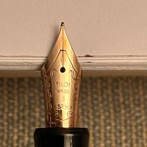 Pennen har en 14k medium splitt, og skriver aldeles nydelig.