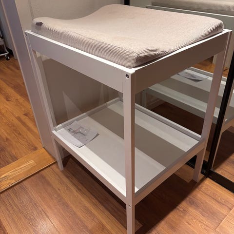 JLY stellebord med badekar i grå farge. Inneholder flere hyller for oppbevaring og hjul for enkel flytting. Designet for å gi en praktisk løsning ved bleieskift og bading av barn.