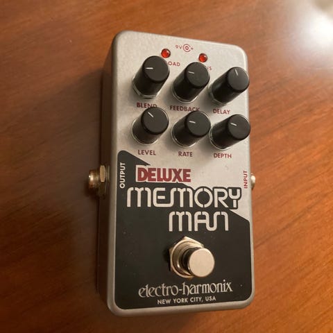 Electro-Harmonix Bad Stone Phase Shifter gitarutstyr med tre kontrollknapper og en fotbryter. Enheten har en metallkonstruksjon med indikatorlampe og bryter for automatisk eller manuell modus. (Ai).