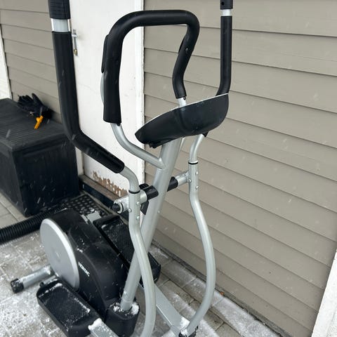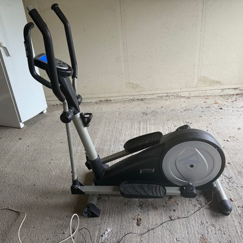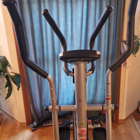Ellipsemaskin med digital skjerm for visning av tid, hastighet, distanse og kaloriforbruk. Utstyrt med justerbar motstand for tilpasset trening. Designet for hjemmebruk med kompakt og plassbesparende konstruksjon.