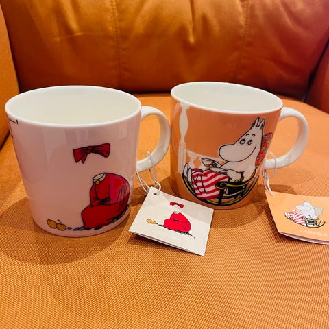 Arabia Mummi krus med motiv fra Mummitrollet. Keramisk materiale, hvit farge med flerfarget dekor.