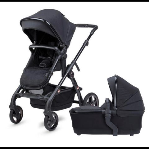 Silver Cross Carrycot i grått stoff og brunt skinn. Regntrekk, myggnetting, carrycot-adaptere og vognveske følger med.
