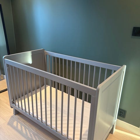 Sprinkelseng eller bedsidecrib til de minste barna. 40x84. Hvit tre. Med praktiske hjul. Flere høydeinnstillinger.