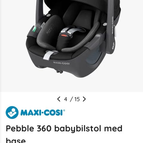 Maxi-Cosi Pebble 360 bilsete til baby med kapasitet opptil 13 kg. Setet har roterende funksjon for enklere plassering av barnet og er utstyrt med sikkerhetsbelter. Designet for bruk i bil for spedbarn.