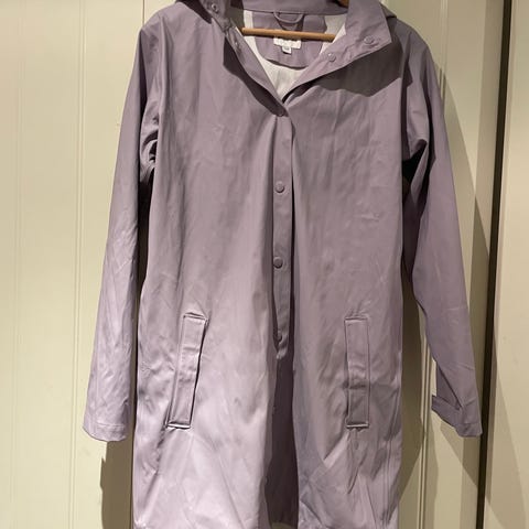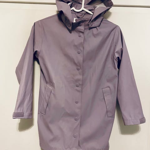 KappAhl regnjakke i størrelse 134 for jente. Jakken er lilla og laget av polyester. Den har hette og knappelukking foran, samt lommer på sidene. Passer til bruk som ytterplagg ved vått vær.