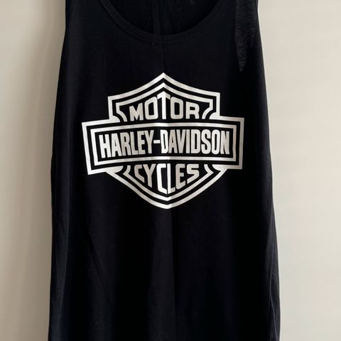 T-skjorten er svart og laget av bomull. Den har et trykk med Harley-Davidson-logo på fronten.