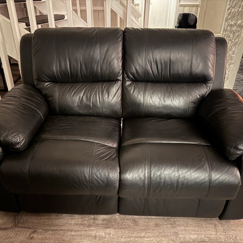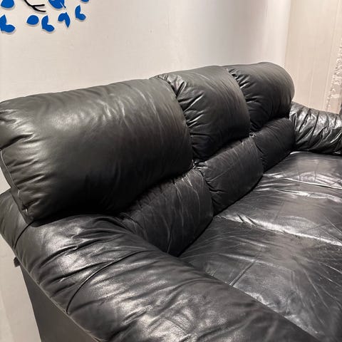Hjørnesofa i sort skinn, robust og lett å vedlikeholde/ holde ren. Kan selges m salongbord for 200kr i tillegg