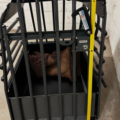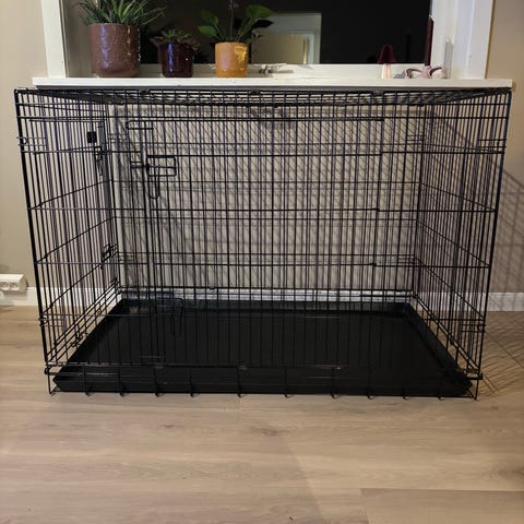 Buret selges da vi har fått ny bil som ikke har plass til buret. Vi har brukt buret til 25 kg goldendoodle.
