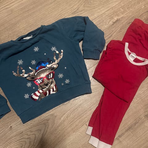 Julepysj i størrelse 122/128, unisex, laget av bomull. Plagget er rødt med mønster av pepperkaker og julemotiver, egnet for barn i alderen 6-8 år. Pysjen har tatt av merkelapper, men er aldri brukt.