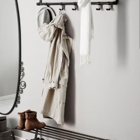 Knaggerekke, hattehylle og mulighet for kleshengere. 80 cm bred, 30 cm høy, 35 cm dyp