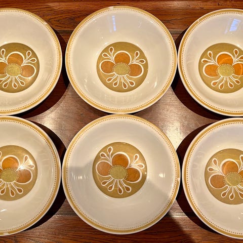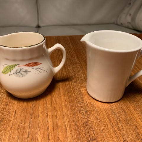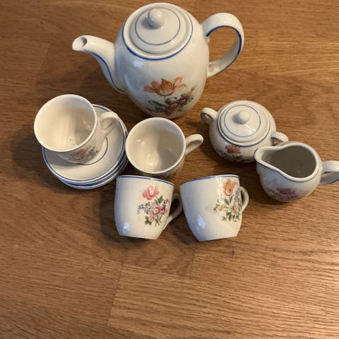 Den ene koppen har et nag. Ellers er settet pent brukt.