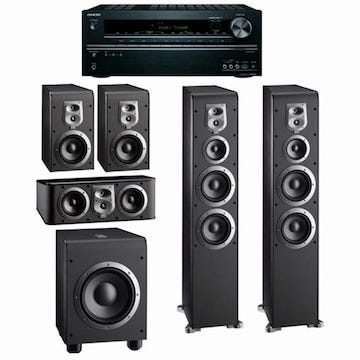 Logitech høyttalersystem med flere satellitthøyttalere, en subwoofer og fjernkontroll. Systemet støtter DTS Digital Surround og THX-sertifisering. Høyttalerne har et svart design og er beregnet for bruk med lydsystemer som krever flere kanaler.