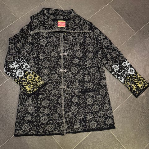 Oleana cardigan i merinoull, størrelse L, farge grå/beige. Plagget er designet for kvinner og har et mønster i flere nyanser av grått. Cardiganen har knappestolpe foran og er laget av merinoull og silke som gir varme og komfort.