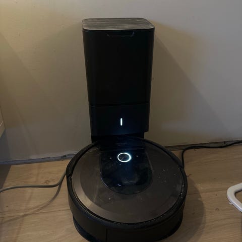 iRobot Roomba robotstøvsuger med rund form og svart farge. Egnet for automatisert rengjøring av gulvflater. Alt tilbehør inkludert.