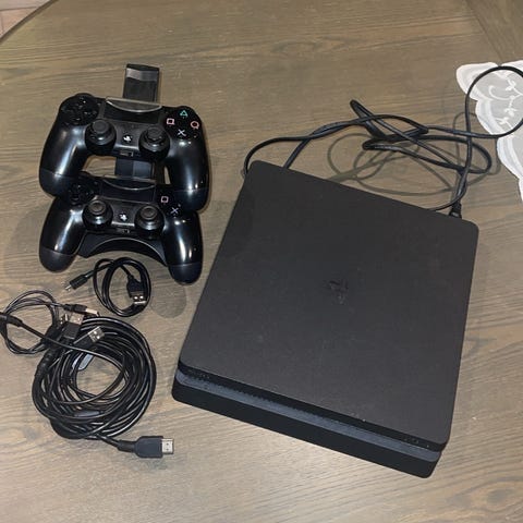 Selger en pent brukt PlayStation 4 Slim 1TB. Konsollen er oppgradert fra vanlig harddisk til SSD, noe som gjør at spill og menyer laster betydelig raskere enn på en standard PS4.