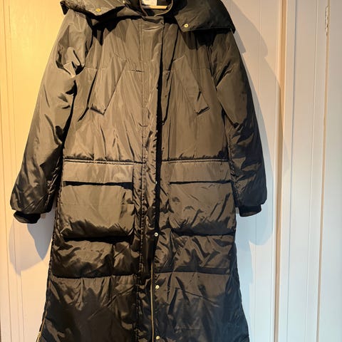YAS Dunkåpe, størrelse XL for kvinner. Kåpen er svart og laget av dun, som gir god isolasjon og varme. Den har hette og lang lengde, egnet for kaldt vær.