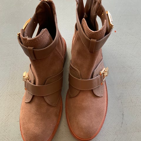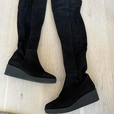 Marc Jacobs støvler i størrelse 38. Laget av rød semsket skinn. Støvlene har ca 8 cm høye hæler. De er løse i skaftet og trekkes på, altså uten glidelås. Det er en liten skade øverst i sømmen på begge sider, som ikke syns godt, men som enkelt kan fikses.
