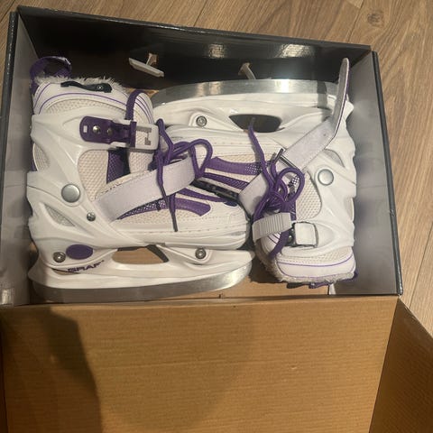 Andre skøyter i størrelse 40 med hvit og rosa farge. Skøytene har snøring og dekorative detaljer i rosa. Egnet for generell skøyting. Kan sendes for 69 kr