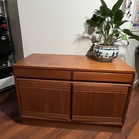 Veldig pent retro skjenk/ skap med skyvedør selger rimelig. Ingen synlig skader og normals bruksmerker. Ser bilder. Døra glir lett. Hull bak og under var for kabel.