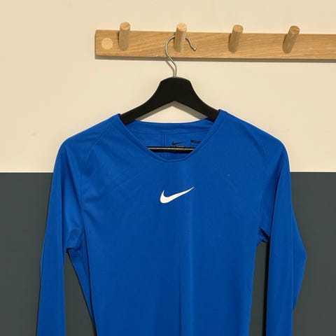 Nike Fotballtrøye i størrelse S, fargene svart og blå. Laget med Dri-FIT materiale for fukttransport. Designet for menn.