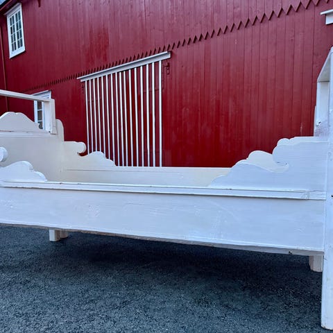 Akkurat passe slitt og rustikk. Tiltenkt som sofa i stue, men den ble akkurat litt for lang. 186 cm er den utvendig.. og madrass mål er 180 cm lang og 60 til 90 bred. Selges på vegne av min datter som flytter.