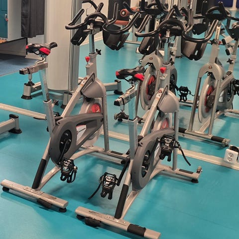 6 stk SB10 spinningsykkel med justerbart sete og styre, designet for innendørs trening. Sykkelen har en solid ramme i blå og svart farge, og inkluderer pedaler med stropp. Egnet for bruk i treningsrom eller hjemme.