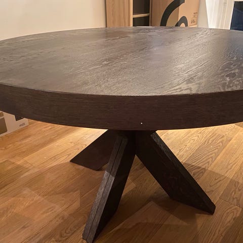 Spisebord, ser så godt som nytt ut generelt, men har en liten "dunkeskade" under bordplaten, som jeg ikke så før nå når jeg tok bilder. Se bildet med skaden. Lett å fikse.