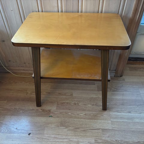 Selger et solid og funksjonelt lite bord/nattbord i heltre, med to åpne hyller. Perfekt som nattbord ved seng, sidebord i stue, eller som oppbevaring på hytte.