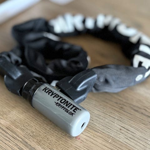 Låsen har en beskyttende tekstiltrekk for å unngå riper og er utformet for å sikre sykler mot tyveri. Det er kjetting inni det blå hylsteret