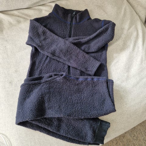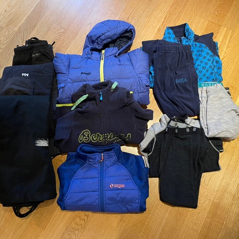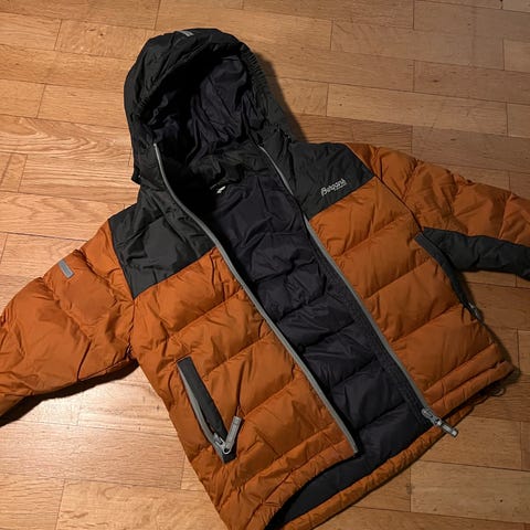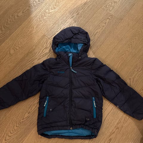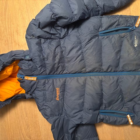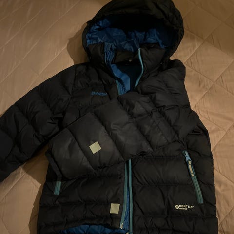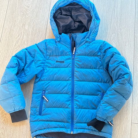 Bergans dunjakke i blå, størrelse 122. Brukt av to barn.