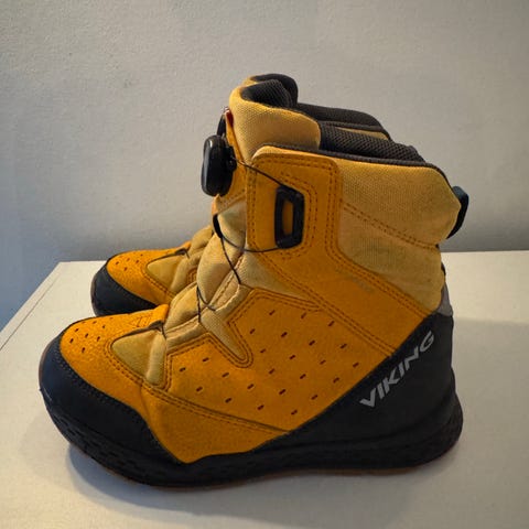 Viking barnesko i størrelse 33, unisex. Skoene har en kombinasjon av materialer med mønsterdetaljer og solide såler, egnet for barn.