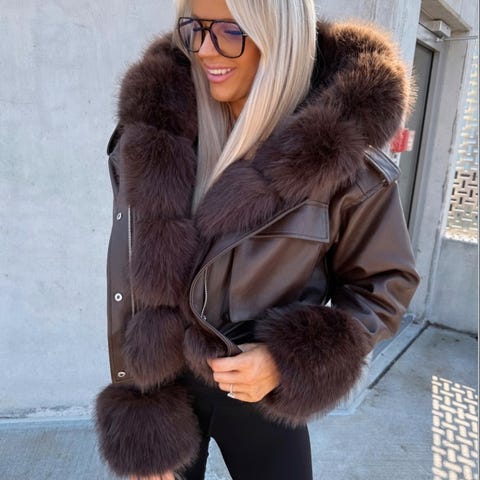 Farge beige/cappuccino. Kan ta av både pels og hetten.
