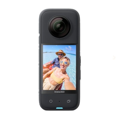 Insta360 X3 actionkamera med 360-graders opptak. Kameraet har en berøringsskjerm og er designet for å fange video og bilder i høy kvalitet fra flere vinkler. Egnet for utendørsaktiviteter og actionopptak.