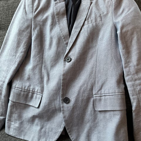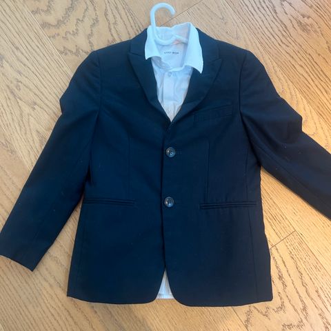 Svart dressjakke og hvit skjorte, fint og lite brukt, i størrelse 134. Skjorten trenger å strykes.