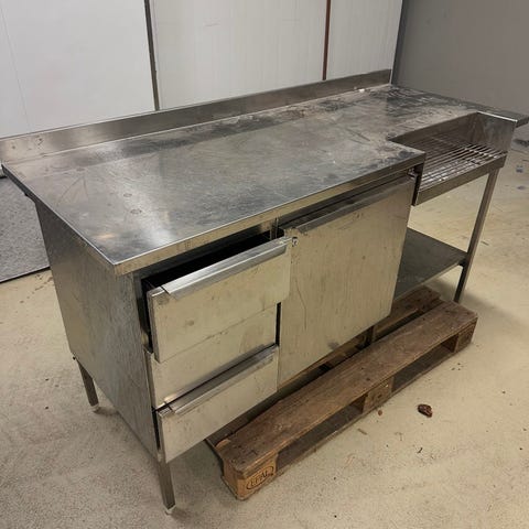Arbeidsbord i rustfritt stål med integrert vask og underhylle. Bordet har en stor flat arbeidsflate og en vask tilknyttet for enkel rengjøring. Underhyllen gir ekstra lagringsplass. Egnet for bruk i kjøkken, verksteder eller andre arbeidsområder som krever slitesterke og hygieniske overflater.