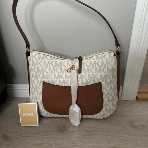 Marc Jacobs dameveske laget av kunstlær. Vesken har to rom med glidelås og en justerbar skulderrem. Den har en kombinasjon av fargene hvit og brun.