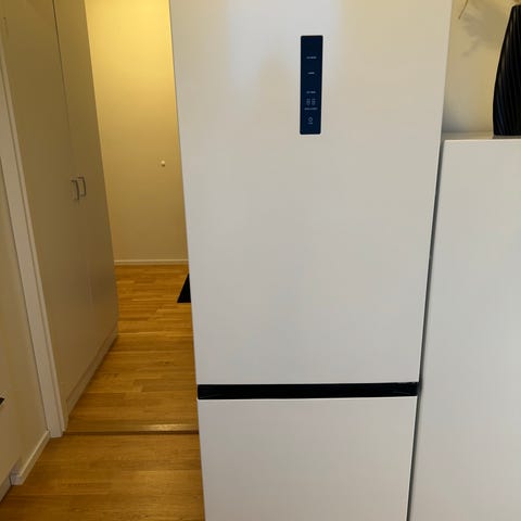 kombiskap med kjøleskap og fryser i samme enhet. Hvitt design med flere hyller og skuffer for oppbevaring. Passer til kjøkkenbruk for oppbevaring av matvarer.