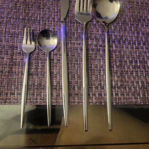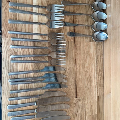 10 kniver, 10-12 gafler, 12 spiseskjeer, 5 teskjeer til salgs samlet. Solid bestikk, gode kniver